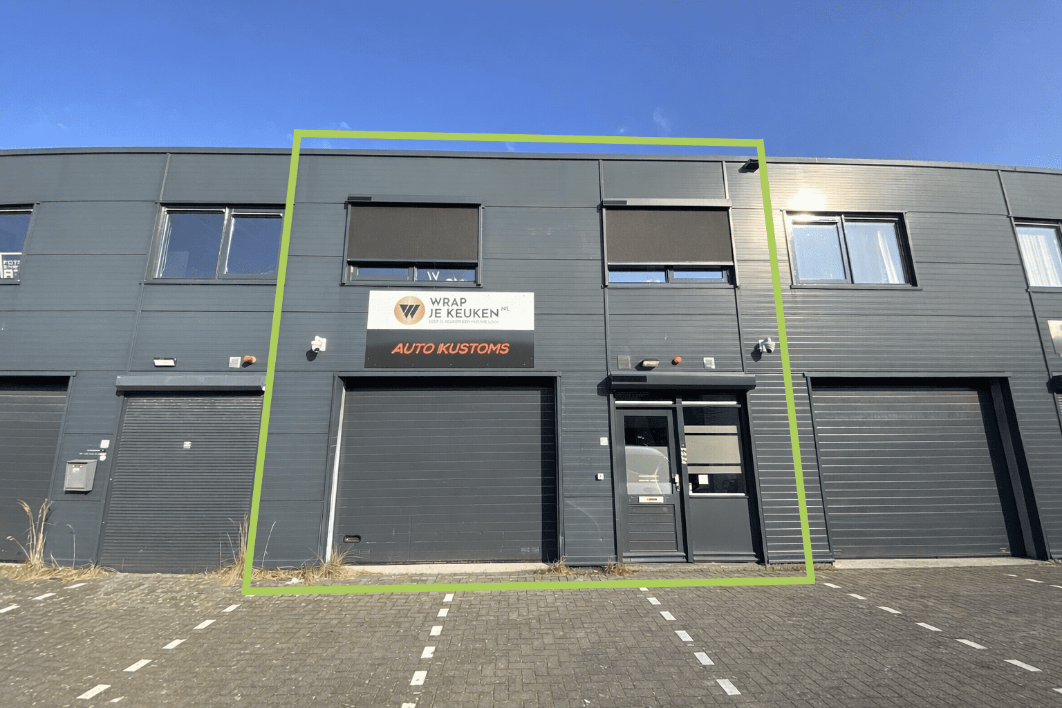 – Bedrijfsruimte met glazen pui met extra kantelraam/deur op de begane grond (nu in gebruik als kantoorruimte) met pantry